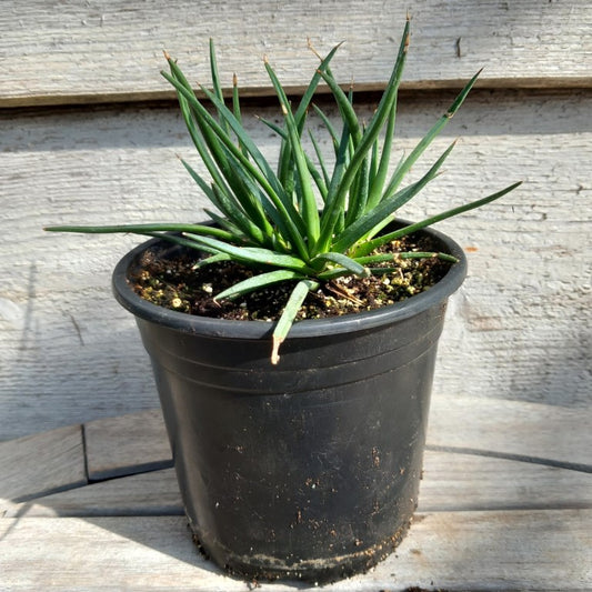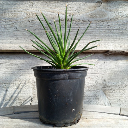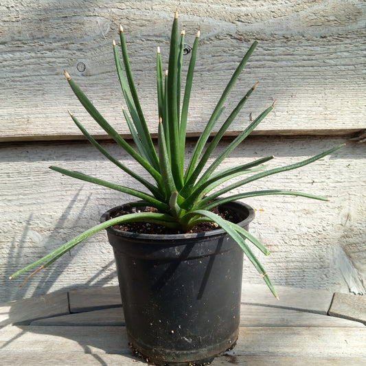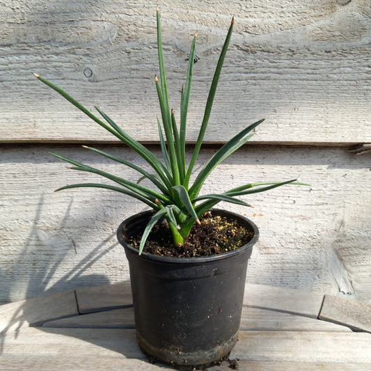 Nach ein paar Jahren entwickeln die Spitzen der grünen umgedrehten Blätter kleine weiße Haarbüschel.