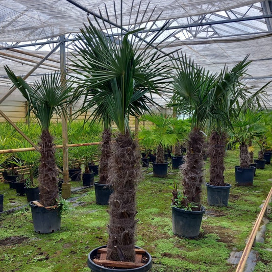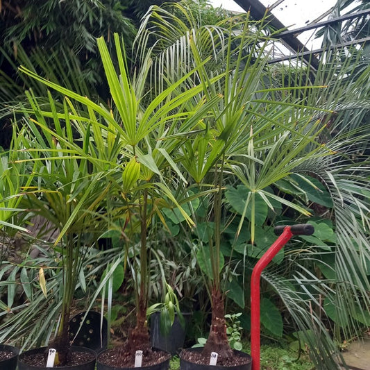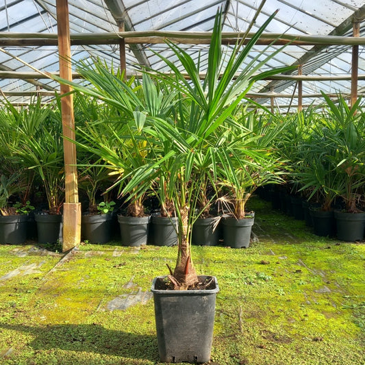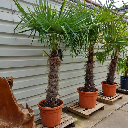 Trachycarpus Fortunei, auch Chinesische Fächerpalme oder Windmühlenpalme genannt, ist eine beliebte Palmenart und gehört daher zu den am häufigsten gepflanzten Gartenpalmen Europas. Diese Palme hat einen robusten, mit Fasern bedeckten Stamm und große, fächerförmige Blätter, die ihr ein tropisches Aussehen verleihen. Trachycarpus Fortunei ist winterhart bis -15 °C und kann gut in gemäßigten Klimazonen gedeihen, was sie zu einer beliebten Wahl für Gärtner auf der ganzen Welt macht. Hanfpalmen mögen einen hellen, windgeschützten Standort. In Regionen mit milden Wintern kann Trachycarpus ab einem Alter von 3–4 Jahren in den Garten gepflanzt werden. Je älter die Pflanze ist, desto eher verträgt sie längere Frostperioden.