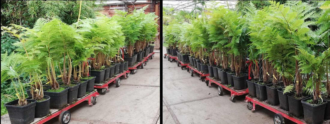 Die Dicksonia Baumfarnstämme bestehen aus lebenden Wurzeln, ihr Vegetationspunkt liegt oben in der Spitze, dadurch können sie in ihrem Herkunftsland mit einer Säge über dem Boden abgetrennt werden. Anschließend werden sie als kahle Stämme gekühlt transportiert. Das Wachstum wird in unserem Land durch Befeuchten des Stammes – insbesondere am oberen Ende – wieder in Gang gesetzt. Ein Dicksonia Baumfarn wird immer in ihren Garten passen, denn er lässt sich auf der gewünschten Höhe absägen. Der obere Teil mit dem Vegetationspunkt kann wieder eingepflanzt werden und wird wieder Wurzeln schlagen. Der untere Teil stirbt ab. Dies erklärt, warum der Stamm aus lebenden Wurzeln feucht gehalten werden muss.